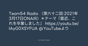 Team54 Radio (第六十二回:2021年3月17日ONAIR)*テーマ「最近、これを卒業しました」 https://youtu.be/IAyG0XSYFUA @YouTubeより