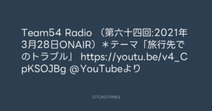 Team54 Radio (第六十四回:2021年3月28日ONAIR)*テーマ「旅行先でのトラブル」 https://youtu.be/v4_CpKSOJBg @YouTubeより