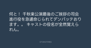 Koyo Maeda @koyomaeda – 13:01・2021年7月21日 2021 7/21 前田耕陽 2021-07-21 何と! 千秋楽公演最後のご挨拶の司会進行役を急遽命じられてデンパッテおります。。 キャストの役名が全然覚えられん。 Source:https://x.com/koyomaeda/status/1417696238363758598 text X Post 前田耕陽 前田耕陽 この記事が気に入ったら フォローしてね! Follow @OtokoTimes1988 よかったらシェアしてね! URLをコピーしました! Koyo Maeda @koyomaeda - 9:44・2021年7月21日 青山英樹 @aoyama_hideki - 0:11・2021年7月22日 関連記事 Artist 前田耕陽 1968.08.16