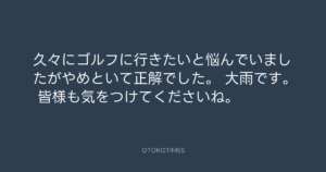 Koyo Maeda @koyomaeda – 10:43・2021年8月12日 2021 8/12 前田耕陽 2021-08-12 久々にゴルフに行きたいと悩んでいましたがやめといて正解でした。 大雨です。 皆様も気をつけてくださいね。 Source:https://x.com/koyomaeda/status/1425633935527079936 text X Post 前田耕陽 前田耕陽 この記事が気に入ったら フォローしてね! Follow @OtokoTimes1988 よかったらシェアしてね! URLをコピーしました! 青山英樹 @aoyama_hideki - 8:50・2021年8月12日 寺岡呼人 @yohito_teraoka - 20:29・2021年8月12日 関連記事 Artist 前田耕陽 1968.08.16