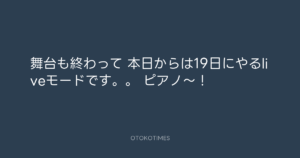 Koyo Maeda @koyomaeda – 12:46・2021年12月1日 2021 12/01 前田耕陽 2021-12-01 舞台も終わって 本日からは19日にやるliveモードです。。 ピアノ〜! Source:https://x.com/koyomaeda/status/1465890039410278403 text X Post 前田耕陽 前田耕陽 この記事が気に入ったら フォローしてね! Follow @OtokoTimes1988 よかったらシェアしてね! URLをコピーしました! Addict of The Tripminds @Atripminds2021 - 10:48・2021年12月1日 Addict of the Trip Minds @atripminds2021 - 11:30・2021年12月2日(IG post) 関連記事 Artist 前田耕陽 1968.08.16