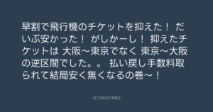 Koyo Maeda @koyomaeda – 15:11・2022年1月12日 2022 1/12 前田耕陽 2022-01-12 早割で飛行機のチケットを抑えた! だいぶ安かった! がしかーし! 抑えたチケットは 大阪〜東京でなく 東京〜大阪の逆区間でした。。 払い戻し手数料取られて結局安く無くなるの巻〜! Source:https://x.com/koyomaeda/status/1481146811410620418 text X Post 前田耕陽 前田耕陽 この記事が気に入ったら フォローしてね! Follow @OtokoTimes1988 よかったらシェアしてね! URLをコピーしました! Koyo Maeda @koyomaeda - 14:21・2022年1月12日 Koyo Maeda @koyomaeda - 15:18・2022年1月12日 関連記事 Artist 前田耕陽 1968.08.16