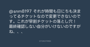 Koyo Maeda @koyomaeda – 15:18・2022年1月12日 2022 1/12 前田耕陽 2022-01-12 @snm8197 それが時間も日にちも決まってるチケットなので変更できないのです。これが早割チケットの落とし穴! 最終確認しない自分がいけないのですがね、、、 Source:https://x.com/koyomaeda/status/1481148507541016577 text X Post 前田耕陽 前田耕陽 この記事が気に入ったら フォローしてね! Follow @OtokoTimes1988 よかったらシェアしてね! URLをコピーしました! Koyo Maeda @koyomaeda - 15:11・2022年1月12日 Koyo Maeda @koyomaeda - 15:38・2022年1月12日 関連記事 Artist 前田耕陽 1968.08.16
