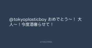Koyo Maeda @koyomaeda – 15:38・2022年1月12日 2022 1/12 前田耕陽 2022-01-12 @tokyoplasticboy おめでとう〜! 大人〜!今度酒奢らせて! Source:https://x.com/koyomaeda/status/1481153605696581632 text X Post 前田耕陽 前田耕陽 この記事が気に入ったら フォローしてね! Follow @OtokoTimes1988 よかったらシェアしてね! URLをコピーしました! Koyo Maeda @koyomaeda - 15:18・2022年1月12日 青山英樹 @aoyama_hideki - 10:42・2022年1月13日 関連記事 Artist 前田耕陽 1968.08.16