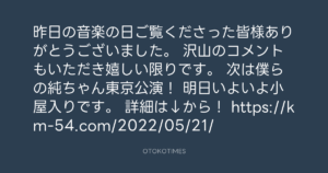 Koyo Maeda @koyomaeda – 10:06・2022年7月17日 2022 7/17 前田耕陽 2022-07-17 昨日の音楽の日ご覧くださった皆様ありがとうございました。 沢山のコメントもいただき嬉しい限りです。 次は僕らの純ちゃん東京公演! 明日いよいよ小屋入りです。 詳細は↓から! https://km-54.com/2022/05/21/ Source:https://x.com/koyomaeda/status/1548474154935992321 text X Post 前田耕陽 前田耕陽 この記事が気に入ったら フォローしてね! Follow @OtokoTimes1988 よかったらシェアしてね! URLをコピーしました! サンケイスポーツ(サンスポ)公式 @sankeisports - 6:16・2022年7月17日 Kazuya Takahashi @hankykazy - 13:02・2022年7月17日(IG post) 関連記事 Artist 前田耕陽 1968.08.16