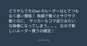 Koyo Maeda @koyomaeda – 19:54・2022年11月24日 2022 11/24 前田耕陽 2022-11-24 どうやらうちのwi-fiルーターはとてつもなく遅い模様! 有線で繋ぐとサクサク動くのに、 サッカーもコマ送りみたいな映像になってしまう。。。 なので新しいルーター買うの確定! Source:https://x.com/koyomaeda/status/1595732560533131264 text X Post 前田耕陽 前田耕陽 この記事が気に入ったら フォローしてね! Follow @OtokoTimes1988 よかったらシェアしてね! URLをコピーしました! 男闘呼組 @otokogumi.tokyo - 19:41・2022年11月24日(IG post) 男闘呼組 @otokogumi.tokyo - 19:56・2022年11月24日(IG post) 関連記事 Artist 前田耕陽 1968.08.16
