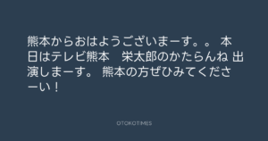 Koyo Maeda @koyomaeda – 8:23・2023年5月24日 2023 5/24 前田耕陽 2023-05-24 熊本からおはようございまーす。。 本日はテレビ熊本 栄太郎のかたらんね 出演しまーす。 熊本の方ぜひみてくださーい! Source:https://x.com/koyomaeda/status/1661150942820192258 text X Post 前田耕陽 前田耕陽 この記事が気に入ったら フォローしてね! Follow @OtokoTimes1988 よかったらシェアしてね! URLをコピーしました! Rockon Social Club @rockonsocialclub - 20:51・2023年5月23日(IG post) 男闘呼組 @otokogumi.tokyo - 11:37・2023年5月24日(IG Stories) 関連記事 Artist 前田耕陽 1968.08.16