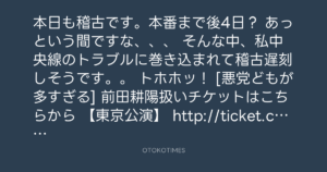 Koyo Maeda @koyomaeda – 12:22・2023年9月21日 2023 9/21 前田耕陽 2023-09-21 本日も稽古です。本番まで後4日? あっという間ですな、、、 そんな中、私中央線のトラブルに巻き込まれて稽古遅刻しそうです。。 トホホッ! [悪党どもが多すぎる] 前田耕陽扱いチケットはこちらから 【東京公演】 http://ticket.corich.jp/apply/273104/0… 【名古屋公演】 http://ticket.corich.jp/apply/273105/0… Source:https://x.com/koyomaeda/status/1704697669942460669 text X Post 前田耕陽 前田耕陽 この記事が気に入ったら フォローしてね! Follow @OtokoTimes1988 よかったらシェアしてね! URLをコピーしました! 寺岡呼人 @yohito_teraoka - 9:25・2023年9月21日 Rockon Social Club @rockonsocialclub - 15:22・2023年9月21日(IG Stories) 関連記事 Artist 前田耕陽 1968.08.16