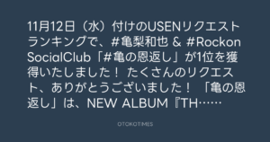 11月12日(水)付けのUSENリクエストランキングで、#亀梨和也 & #RockonSocialClub「#亀の恩返し」が1位を獲得いたしました!