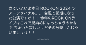 Koyo Maeda @koyomaeda – 12:10・2024年9月16日 2024 9/16 前田耕陽 2024-09-16 さていよいよ本日 ROCKON 2024 ツアーファイナル。。 台風で延期になった公演ですが!! 今年のROCK ONライブはこれで見納めになっちゃうのかな? ちょいと寂しいけどその分楽しんじゃいましょう!! Source:https://x.com/koyomaeda/status/1835516621798170778 text X Post 前田耕陽 前田耕陽 この記事が気に入ったら フォローしてね! Follow @OtokoTimes1988 よかったらシェアしてね! URLをコピーしました! Rockon Social Club @rockonsocialclu - 11:48・2024年9月16日 Rockon Social Club @rockonsocialclu - 13:40・2024年9月16日 関連記事 Artist 前田耕陽 1968.08.16