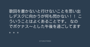 Koyo Maeda @koyomaeda – 13:20・2024年11月13日 2024 11/13 前田耕陽 2024-11-13 歌詞を書かないと行けないことを思い出しデスクに向かうが何も閃かない!! こういうことはよくあることです。 なのでボケナス〜とした午後を過ごしてます。。。 Source:https://x.com/koyomaeda/status/1856552803017376207 text X Post 前田耕陽 前田耕陽 この記事が気に入ったら フォローしてね! Follow @OtokoTimes1988 よかったらシェアしてね! URLをコピーしました! Kazuya Takahashi @hankykazy - 03:23・2024年11月13日(IG post) Koyo Maeda @koyomaeda - 18:58・2024年11月13日 関連記事 Artist 前田耕陽 1968.08.16