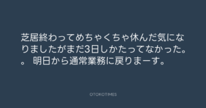 芝居終わってめちゃくちゃ休んだ気になりましたがまだ3日しかたってなかった。。