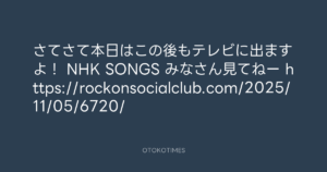 Koyo Maeda @koyomaeda – 17:42・2025年11月13日 2025 11/13 前田耕陽 2025-11-13 さてさて本日はこの後もテレビに出ますよ! NHK SONGS みなさん見てねー https://rockonsocialclub.com/2025/11/05/6720/ Source:https://x.com/koyomaeda/status/1988890201641333222 text X Post 前田耕陽 前田耕陽 この記事が気に入ったら フォローしてね! Follow @OtokoTimes1988 よかったらシェアしてね! URLをコピーしました! 北斗晶 Akira Hokuto @hokutoakira_official - 17:25・2025年11月13日 Koyo Maeda @koyomaeda - 18:20・2025年11月13日 関連記事 Artist 前田耕陽 1968.08.16