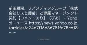 前田耕陽、リズメディアグループ「株式会社リスと葡萄」と専属マネージメント契約【コメントあり】(ぴあ) – Yahoo!ニュース https://news.yahoo.co.jp/articles/c24a7f16d36781fd75ca188ec08f9a3e044d41bc
