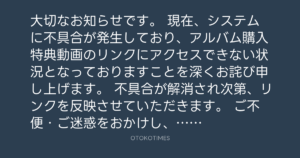 現在、システムに不具合が発生しており、アルバム購入特典動画のリンクにアクセスできない状況となっておりますことを深くお詫び申し上げます。