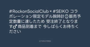Rockon Social Club @rockonsocialclu – 17:45・2024年4月9日 2024 4/09 Rockon Social Club 2024-04-09 📢#RockonSocialClub×#SEIKO コラボレーション限定モデル腕時計⌚️ 販売予定数量に達したため 受注終了となります🙇♂️ 商品到着まで 今しばらくお待ちください📦 Source:https://x.com/rockonsocialclu/status/1777618703... Rockon Social Club text X Post Rockon Social Club この記事が気に入ったら フォローしてね! Follow @OtokoTimes1988 よかったらシェアしてね! URLをコピーしました! タワーレコード広島店 @TOWER_Hiroshima - 17:40・2024年4月9日 東京レコード @tokyo_records - 18:00・2024年4月9日 関連記事 Artist Rockon Social Club 2023.02.17