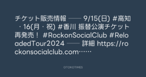Rockon Social Club @rockonsocialclu – 12:00・2024年9月3日 2024 9/03 Rockon Social Club 2024-09-03 📢チケット販売情報🎫 🎸── 9/15(日) #高知 ・16(月・祝) #香川 振替公演チケット再発売! #RockonSocialClub #ReloadedTour2024 ──🎤 詳細👇 https://rockonsocialclub.com/2024/09/03/3366/ Source:https://x.com/rockonsocialclu/status/1830802903... Rockon Social Club text X Post Rockon Social Club この記事が気に入ったら フォローしてね! Follow @OtokoTimes1988 よかったらシェアしてね! URLをコピーしました! CDTV @TBSCDTV - 11:01・2024年9月3日 Rockon Social Club @rockonsocialclu - 12:00・2024年9月3日 関連記事 Artist Rockon Social Club 2023.02.17