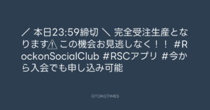 Rockon Social Club @rockonsocialclu – 13:40・2024年9月16日 2024 9/16 Rockon Social Club 2024-09-16 / 📢本日23:59締切 \ 完全受注生産となります⚠️ この機会お見逃しなく!! #RockonSocialClub #RSCアプリ #今から入会でも申し込み可能 Source:https://x.com/rockonsocialclu/status/1835539232... Rockon Social Club text X Post Rockon Social Club この記事が気に入ったら フォローしてね! Follow @OtokoTimes1988 よかったらシェアしてね! URLをコピーしました! Koyo Maeda @koyomaeda - 12:10・2024年9月16日 Rockon Social Club @rockonsocialclu - 18:20・2024年9月16日 関連記事 Artist Rockon Social Club 2023.02.17