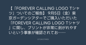 9月5日(金)東京ガーデンシアターでご購入いただいた「FOREVER CALLING LOGO Tシャツ」に関し、プリントが非常に剥がれやすいという事象が確認されております。