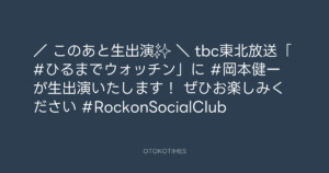 Rockon Social Club @rockonsocialclu – 10:06・2025年10月20日 2025 10/20 Rockon Social Club 2025-10-20 / 📺このあと生出演✨ \ tbc東北放送「#ひるまでウォッチン」に #岡本健一 が生出演いたします! ぜひお楽しみください🎵 #RockonSocialClub Source:https://x.com/rockonsocialclu/status/1980078042... Rockon Social Club text X Post Rockon Social Club この記事が気に入ったら フォローしてね! Follow @OtokoTimes1988 よかったらシェアしてね! URLをコピーしました! ウォッチン!スタッフ @watchinstaff - 9:15・2025年10月20日 Rockon Social Club @rockonsocialclu - 11:54・2025年10月20日 関連記事 Artist Rockon Social Club 2023.02.17