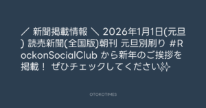 Rockon Social Club @rockonsocialclu – 4:00・2026年1月1日 2026 1/01 Rockon Social Club 2026-01-01 / 📢新聞掲載情報🎍 \ 🎊2026年1月1日(元旦) 読売新聞(全国版)朝刊 元旦別刷り #RockonSocialClub から新年のご挨拶を掲載! ぜひチェックしてください📰✨ Source:https://x.com/rockonsocialclu/status/2006440216... Rockon Social Club text X Post Rockon Social Club この記事が気に入ったら フォローしてね! Follow @OtokoTimes1988 よかったらシェアしてね! URLをコピーしました! ミッキー吉野 @mickieyoshino - 0:35・2026年1月1日 🎬 Steelpan Records_Nori Shiota @norishio88 - 4:27・2026年1月1日 関連記事 Artist Rockon Social Club 2023.02.17
