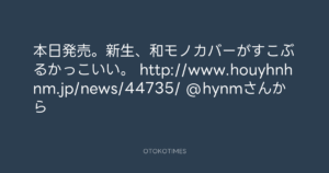 東京レコード @tokyo_records – 10:22・2017年2月23日 2017 2/23 2017-02-23 本日発売。新生、和モノカバーがすこぶるかっこいい。 http://www.houyhnhnm.jp/news/44735/ @hynmさんから Source:https://x.com/tokyo_records/status/834574073183... text X Post この記事が気に入ったら フォローしてね! Follow @OtokoTimes1988 よかったらシェアしてね! URLをコピーしました! Koyo Maeda @koyomaeda - 10:17・2017年2月23日 東京レコード @tokyo_records - 10:25・2017年2月23日