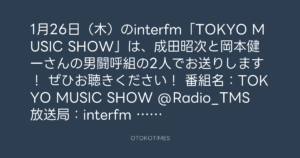1月26日(木)のinterfm「TOKYO MUSIC SHOW」は、成田昭次と岡本健一さんの男闘呼組の2人でお送りします!