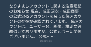 現在、成田昭次・成田商事の公式SNSアカウントを装った偽アカウントの存在が確認されています。 偽アカウントは、ユーザー名、画像、説明文等酷似しておりますが、公式とは一切関係ございません。