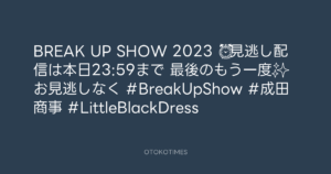 東京レコード @tokyo_records – 12:13・2023年10月11日 2023 10/11 2023-10-11 🎸BREAK UP SHOW 2023🎸 ⏰見逃し配信は本日23:59まで👀 最後のもう一度✨ お見逃しなく👀 #BreakUpShow #成田商事 #LittleBlackDress Source:https://x.com/tokyo_records/status/171194297800... text X Post この記事が気に入ったら フォローしてね! Follow @OtokoTimes1988 よかったらシェアしてね! URLをコピーしました! Addict of The Tripminds @Atripminds2021 - 12:11・2023年10月11日 NARITA THOMAS SIMPSON @narita.corp - 13:42・2023年10月11日(IG post)