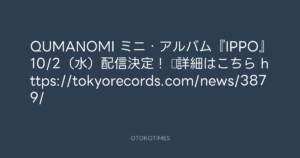 東京レコード @tokyo_records – 16:00・2024年8月23日 2024 8/23 2024-08-23 QUMANOMI ミニ・アルバム『IPPO』10/2(水)配信決定! ▼詳細はこちら https://tokyorecords.com/news/3879/ Source:https://x.com/tokyo_records/status/182687703555... text X Post この記事が気に入ったら フォローしてね! Follow @OtokoTimes1988 よかったらシェアしてね! URLをコピーしました! OTOKOTIMES @OtokoTimes1988 - 13:21・2024年8月23日 ニッポン放送「KURE オキーフ Presents 成田昭次のRockon The Knight」 @RockonTheKnight - 17:06・2024年8月23日