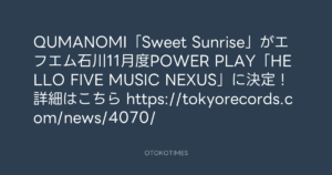 東京レコード @tokyo_records – 12:00・2024年11月1日 2024 11/01 2024-11-01 QUMANOMI「Sweet Sunrise」がエフエム石川11月度POWER PLAY「HELLO FIVE MUSIC NEXUS」に決定! 詳細はこちら https://tokyorecords.com/news/4070/ Source:https://x.com/tokyo_records/status/185218378658... text X Post この記事が気に入ったら フォローしてね! Follow @OtokoTimes1988 よかったらシェアしてね! URLをコピーしました! 写真 @SHOJI'S STORY・2024年11月1日(CLUB 55) Koyo Maeda @koyomaeda - 15:40・2024年11月1日