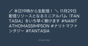 東京レコード @tokyo_records – 17:00・2024年11月25日 2024 11/25 2024-11-25 / 📢本日19時から生配信! \ 11月29日配信リリースとなるミニアルバム「FANTASIA」をいち早く聴けます🎶 #NARITATHOMASSIMPSON #ナリトマファンタジー #FANTASIA Source:https://x.com/tokyo_records/status/186095659109... text X Post この記事が気に入ったら フォローしてね! Follow @OtokoTimes1988 よかったらシェアしてね! URLをコピーしました! NARITA THOMAS SIMPSON @narita.corp - 12:10・2024年11月25日(IG Stories) ステージナタリー @stage_natalie - 19:00・2024年11月25日