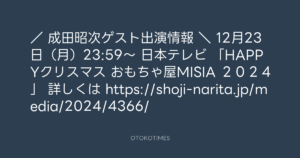 東京レコード @tokyo_records – 12:41・2024年12月9日 2024 12/09 2024-12-09 / 📢成田昭次ゲスト出演情報🎄 \ 12月23日(月)23:59〜 日本テレビ 「HAPPYクリスマス おもちゃ屋MISIA 2024」 詳しくは👇 https://shoji-narita.jp/media/2024/4366/ Source:https://x.com/tokyo_records/status/186596485687... text X Post この記事が気に入ったら フォローしてね! Follow @OtokoTimes1988 よかったらシェアしてね! URLをコピーしました! OTOKOTIMES @OtokoTimes1988 - 12:37・2024年12月9日 OTOKOTIMES @OtokoTimes1988 - 13:08・2024年12月9日