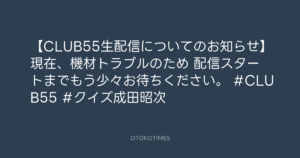 東京レコード @tokyo_records – 20:06・2025年4月18日 2025 4/18 2025-04-18 【CLUB55生配信についてのお知らせ】 現在、機材トラブルのため 配信スタートまでもう少々お待ちください。 #CLUB55 #クイズ成田昭次 Source:https://x.com/tokyo_records/status/191318739871... text X Post この記事が気に入ったら フォローしてね! Follow @OtokoTimes1988 よかったらシェアしてね! URLをコピーしました! 東京レコード @tokyo_records - 19:50・2025年4月18日 東京レコード @tokyo_records - 20:34・2025年4月18日