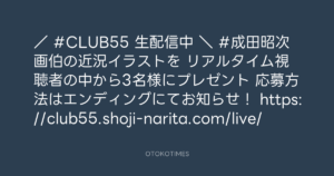 東京レコード @tokyo_records – 20:17・2025年5月16日 2025 5/16 2025-05-16 / #CLUB55 生配信中 \ #成田昭次 画伯の近況イラストを リアルタイム視聴者の中から3名様にプレゼント🎁 応募方法はエンディングにてお知らせ! https://club55.shoji-narita.com/live/ Source:https://x.com/tokyo_records/status/192333712780... text X Post この記事が気に入ったら フォローしてね! Follow @OtokoTimes1988 よかったらシェアしてね! URLをコピーしました! 東京レコード @tokyo_records - 19:43・2025年5月16日 東京レコード @tokyo_records - 20:37・2025年5月16日