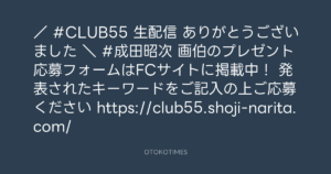 東京レコード @tokyo_records – 21:07・2025年5月16日 2025 5/16 2025-05-16 / #CLUB55 生配信 ありがとうございました \ #成田昭次 画伯のプレゼント応募フォームはFCサイトに掲載中! 発表されたキーワードをご記入の上ご応募ください📮 https://club55.shoji-narita.com/ Source:https://x.com/tokyo_records/status/192334968663... text X Post この記事が気に入ったら フォローしてね! Follow @OtokoTimes1988 よかったらシェアしてね! URLをコピーしました! 東京レコード @tokyo_records - 20:53・2025年5月16日 東京レコード @tokyo_records - 21:29・2025年5月16日