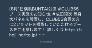 東京レコード @tokyo_records – 22:23・2025年6月20日 2025 6/20 2025-06-20 ◤8月1日横浜BUNTAI公演 #CLUB55 ブース実施のお知らせ◢ #成田昭次 等身大パネルを設置し、CLUB55会員の方に2ショットを撮影していただけるブースをご用意します! 詳しくは👇 https://shoji-narita.jp/live/2025/4682/ Source:https://x.com/tokyo_records/status/193605238785... text X Post この記事が気に入ったら フォローしてね! Follow @OtokoTimes1988 よかったらシェアしてね! URLをコピーしました! 東京レコード @tokyo_records - 21:53・2025年6月20日 東京レコード @tokyo_records - 10:11・2025年6月21日