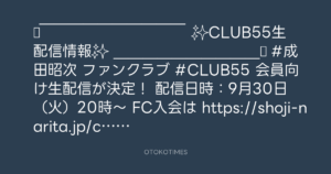 東京レコード @tokyo_records – 19:13・2025年9月22日 2025 9/22 2025-09-22 ◤ ̄ ̄ ̄ ̄ ̄ ̄ ̄ ̄ ̄ ̄ ✨CLUB55生配信情報✨ __________◢ #成田昭次 ファンクラブ #CLUB55 会員向け生配信が決定! 配信日時:9月30日(火)20時〜 FC入会は👇 https://shoji-narita.jp/club55/ Source:https://x.com/tokyo_records/status/197006882741... text X Post この記事が気に入ったら フォローしてね! Follow @OtokoTimes1988 よかったらシェアしてね! URLをコピーしました! FM COCOLO🌏76.5MHz @fmcocolo765 - 17:53・2025年9月22日 青山英樹 @aoyama_hideki - 22:07・2025年9月22日