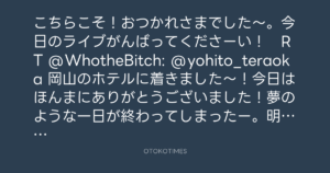 こちらこそ!おつかれさまでした〜。今日のライブがんばってくださーい! RT @WhotheBitch: @yohito_teraoka 岡山のホテルに着きました~!今日はほんまにありがとうございました!夢のような一日が終わってしまったー。明日も楽しみます。おやすみなさいー。