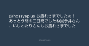 @hassyeplus お疲れさまでしたぁ! あっとう間の三日間でしたね‼今井さん、いしわたりさんもお疲れさまでした