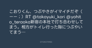 こおりくん、つぶやきがイマイチだぞ(ーー;)RT @takayuki_kori @yohito_teraoka新宿の本社で打ち合わせしてまう。相方がトイレ行った隙につぶやいてまう…