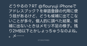 どうやるの?RT @flouryuji iPhoneでアドレスブック?を単語登録の代用に使う技があるけど、どうも候補に出てこないことが多々。個人的に調べた結果、候補に出ないときはメモリ不足の様子。残り2MB以下とかしょっちゅうなのよね。。メモリ掃除すると直ります。