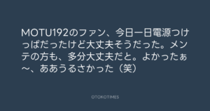 寺岡呼人 @yohito_teraoka – 22:20・2010年4月7日 2010 4/07 寺岡呼人 2010-04-07 MOTU192のファン、今日一日電源つけっぱだったけど大丈夫そうだった。メンテの方も、多分大丈夫だと。よかったぁ〜、ああうるさかった(笑) Source:https://x.com/yohito_teraoka/status/11755892824 text X Post 寺岡呼人 寺岡呼人 この記事が気に入ったら フォローしてね! Follow @OtokoTimes1988 よかったらシェアしてね! URLをコピーしました! 寺岡呼人 @yohito_teraoka - 11:14・2010年4月7日 寺岡呼人 @yohito_teraoka - 23:27・2010年4月7日 関連記事 Artist 寺岡呼人 1968.02.07