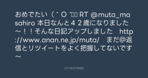 おめでたい(^O^☆♪ RT @muta_masahiro 本日なんと42歳になりました~!!そんな日記アップしました http://www.anan.ne.jp/muta/ まだ@返信とリツイートをよく把握してないです~