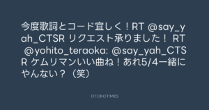 今度歌詞とコード宜しく!RT @say_yah_CTSR リクエスト承りました! RT @yohito_teraoka: @say_yah_CTSR ケムリマンいい曲ね!あれ5/4一緒にやんない?(笑)