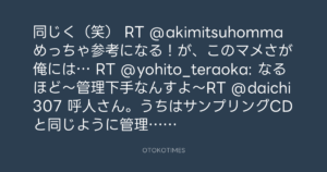 RT @akimitsuhomma めっちゃ参考になる!が、このマメさが俺には… RT @yohito_teraoka: なるほど~管理下手なんすよ~RT @daichi307 呼人さん。うちはサンプリングCDと同じように管理してますです。 (cont…