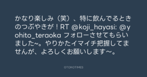 寺岡呼人 @yohito_teraoka – 12:14・2010年5月7日 2010 5/07 寺岡呼人 2010-05-07 かなり楽しみ(笑)、特に飲んでるときのつぶやきが!RT @koji_hayasi: @yohito_teraoka フォローさせてもらいました~。やりかたイマイチ把握してませんが、よろしくお願いします〜。 Source:https://x.com/yohito_teraoka/status/13525702543 text X Post 寺岡呼人 寺岡呼人 この記事が気に入ったら フォローしてね! Follow @OtokoTimes1988 よかったらシェアしてね! URLをコピーしました! 寺岡呼人 @yohito_teraoka - 11:50・2010年5月7日 寺岡呼人 @yohito_teraoka - 12:15・2010年5月7日 関連記事 Artist 寺岡呼人 1968.02.07