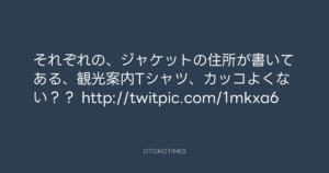寺岡呼人 @yohito_teraoka – 10:55・2010年5月10日 2010 5/10 寺岡呼人 2010-05-10 それぞれの、ジャケットの住所が書いてある、観光案内Tシャツ、カッコよくない?? http://twitpic.com/1mkxa6 Source:https://x.com/yohito_teraoka/status/13700649903 text X Post 寺岡呼人 寺岡呼人 この記事が気に入ったら フォローしてね! Follow @OtokoTimes1988 よかったらシェアしてね! URLをコピーしました! 寺岡呼人 @yohito_teraoka - 10:53・2010年5月10日 寺岡呼人 @yohito_teraoka - 11:09・2010年5月10日 関連記事 Artist 寺岡呼人 1968.02.07