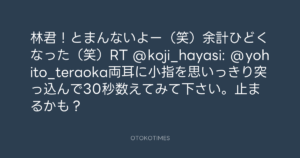 寺岡呼人 @yohito_teraoka – 1:36・2010年5月13日 2010 5/13 寺岡呼人 2010-05-13 林君!とまんないよー(笑)余計ひどくなった(笑)RT @koji_hayasi: @yohito_teraoka両耳に小指を思いっきり突っ込んで30秒数えてみて下さい。止まるかも? Source:https://x.com/yohito_teraoka/status/13860104808 text X Post 寺岡呼人 寺岡呼人 この記事が気に入ったら フォローしてね! Follow @OtokoTimes1988 よかったらシェアしてね! URLをコピーしました! 寺岡呼人 @yohito_teraoka - 1:19・2010年5月13日 寺岡呼人 @yohito_teraoka - 1:41・2010年5月13日 関連記事 Artist 寺岡呼人 1968.02.07