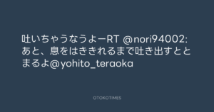 寺岡呼人 @yohito_teraoka – 1:47・2010年5月13日 2010 5/13 寺岡呼人 2010-05-13 吐いちゃうなうよーRT @nori94002: あと、息をはききれるまで吐き出すととまるよ@yohito_teraoka Source:https://x.com/yohito_teraoka/status/13860606878 text X Post 寺岡呼人 寺岡呼人 この記事が気に入ったら フォローしてね! Follow @OtokoTimes1988 よかったらシェアしてね! URLをコピーしました! 寺岡呼人 @yohito_teraoka - 1:44・2010年5月13日 寺岡呼人 @yohito_teraoka - 1:52・2010年5月13日 関連記事 Artist 寺岡呼人 1968.02.07